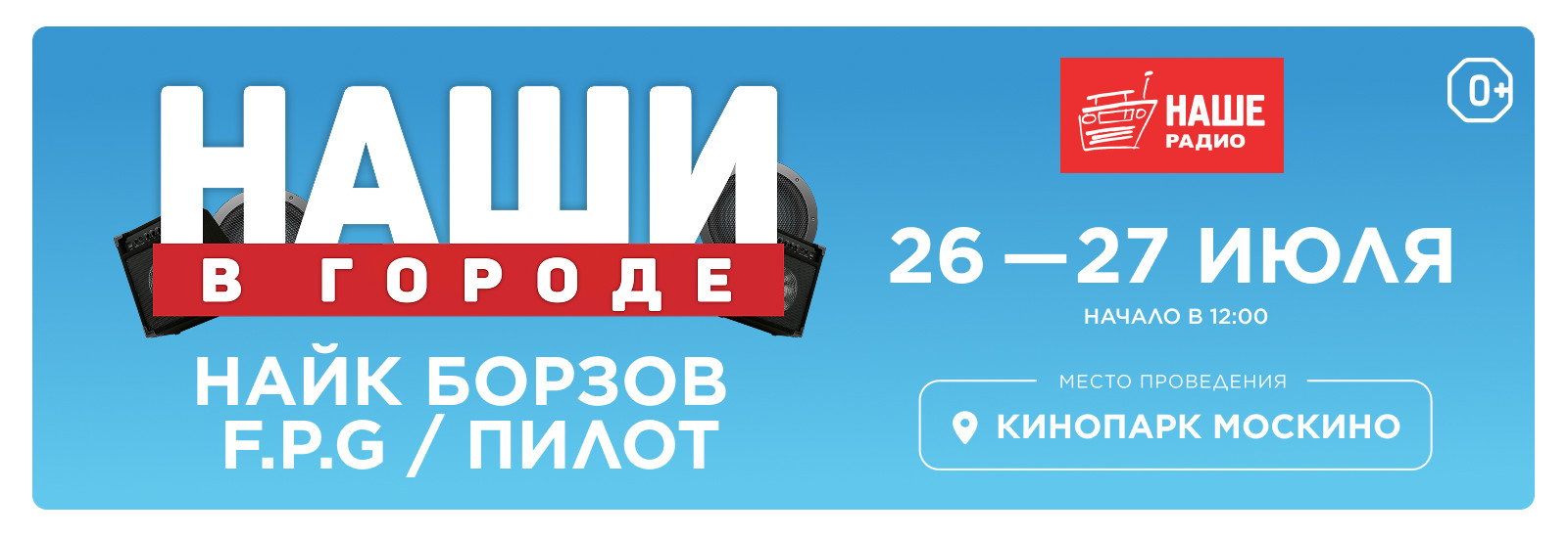 Объявлена первая тройка участников фестивале «НАШИ в Городе»! 27 июля в кинопарке «Москино» сыграют сеты группы «ПилОт» и F.P.G , а Найк Борзов исполнит свои хиты 26 июля.