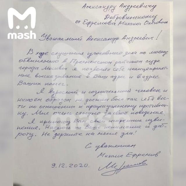 Михаил Ефремов продолжает извиняться, сообщает телеграм-канал Mash.